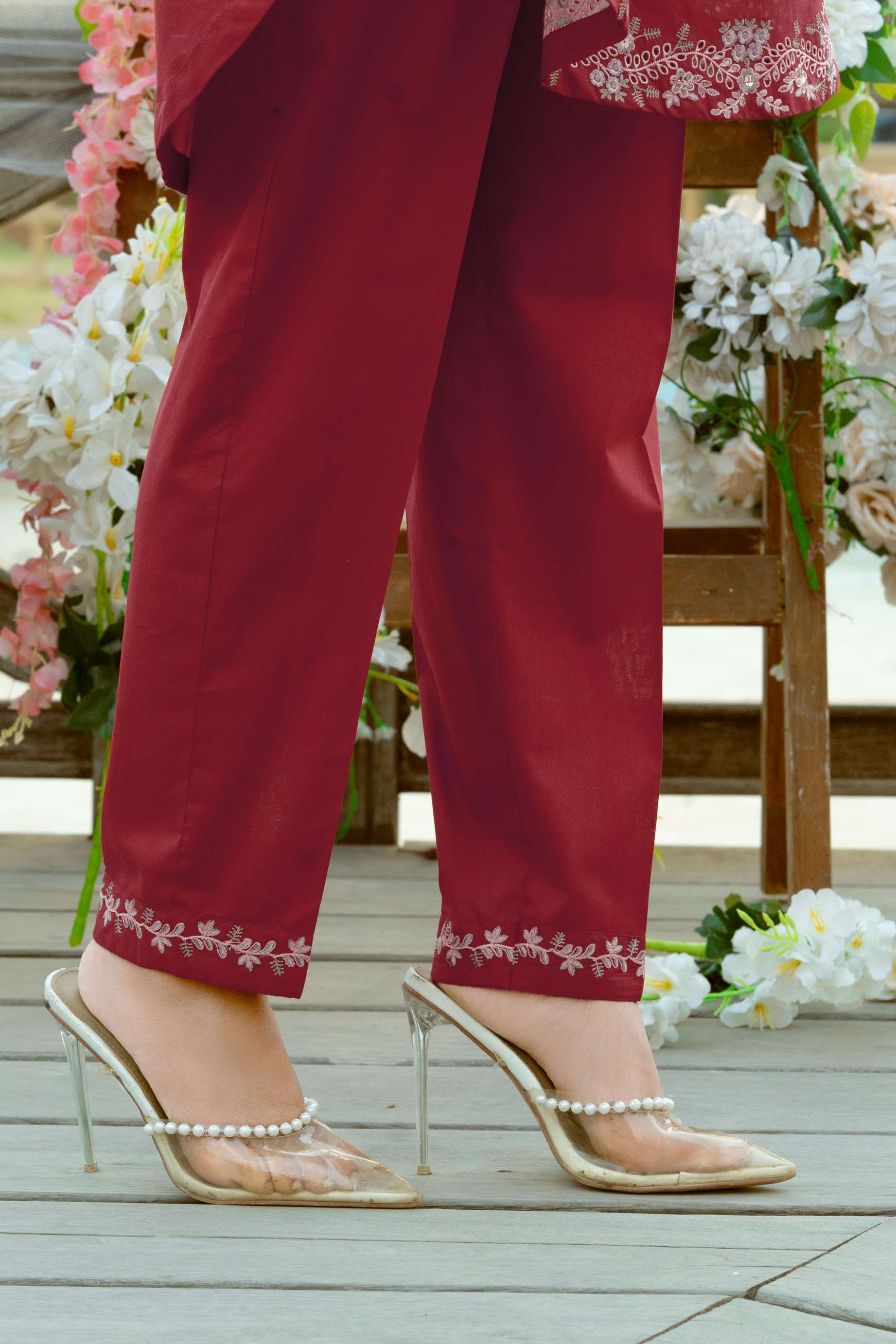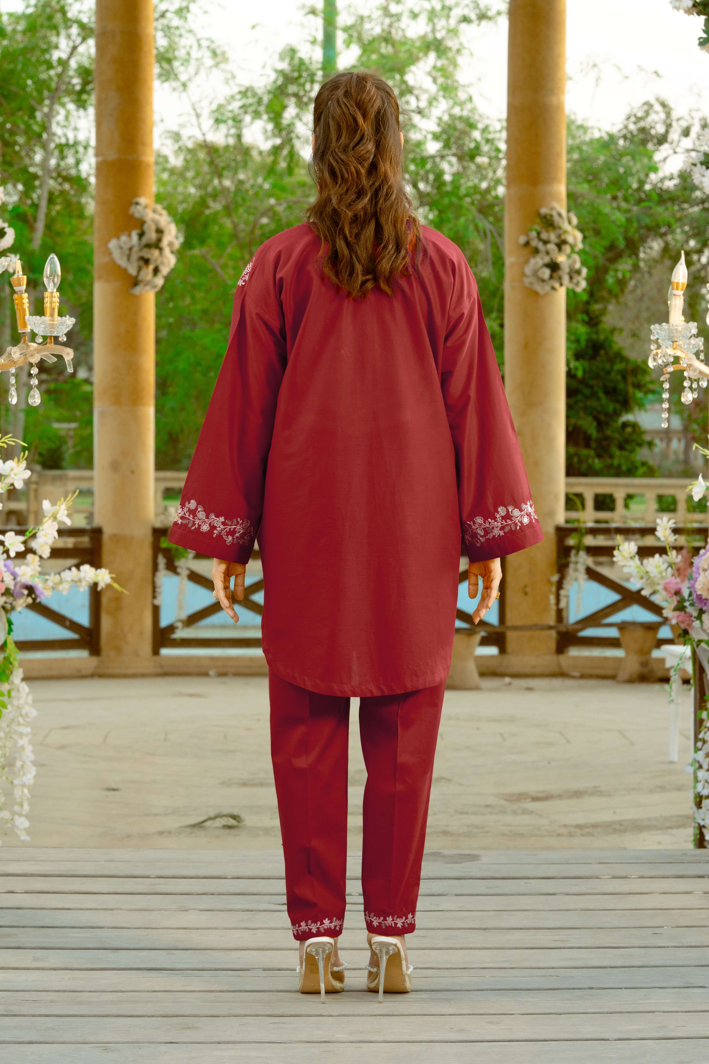 Red Dyed Embroidered Lawn Shirt with Dyed Embroidered Cambric Trouser