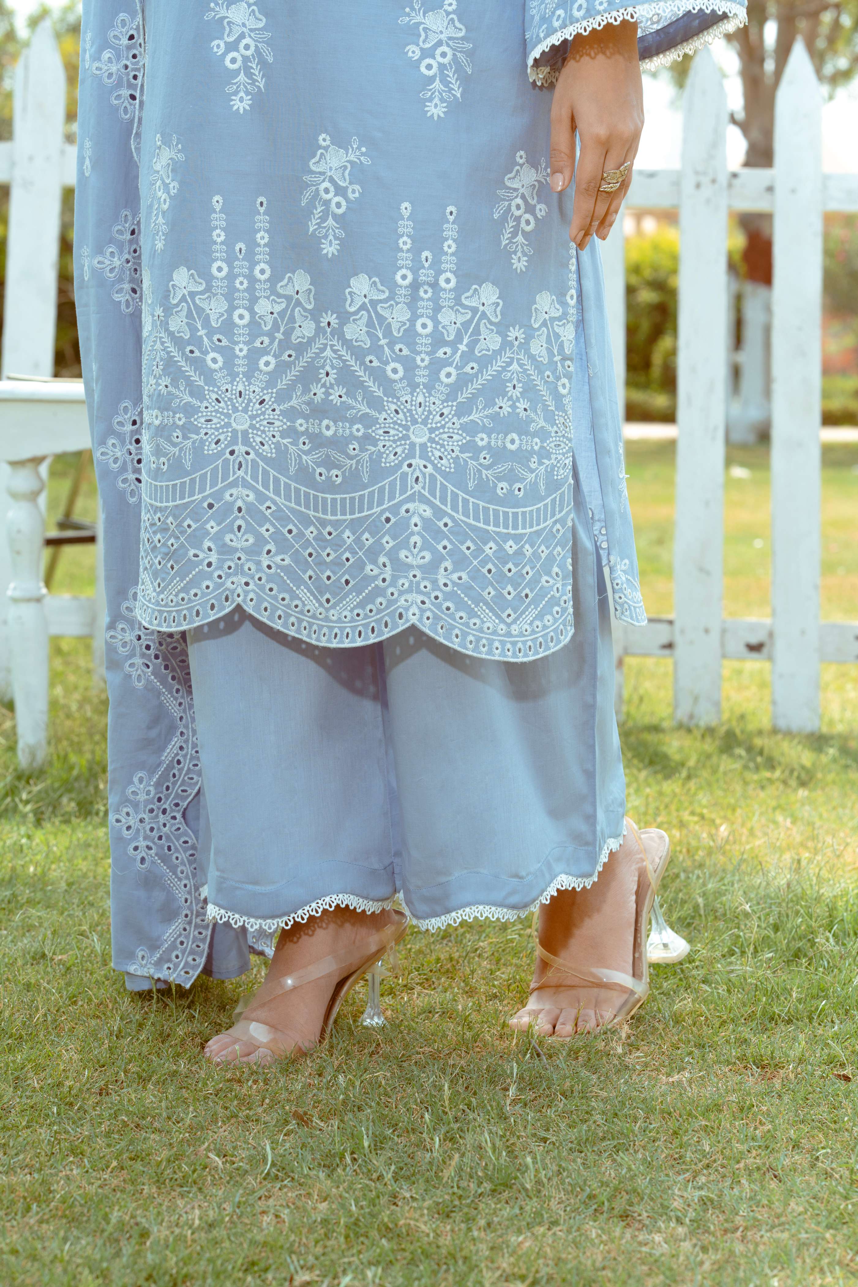Lavender Schiffli Embroidered Lawn Shirt  paired with Schiffli Embroidered Voil Dupatta and Dyed Cambric Trouser.