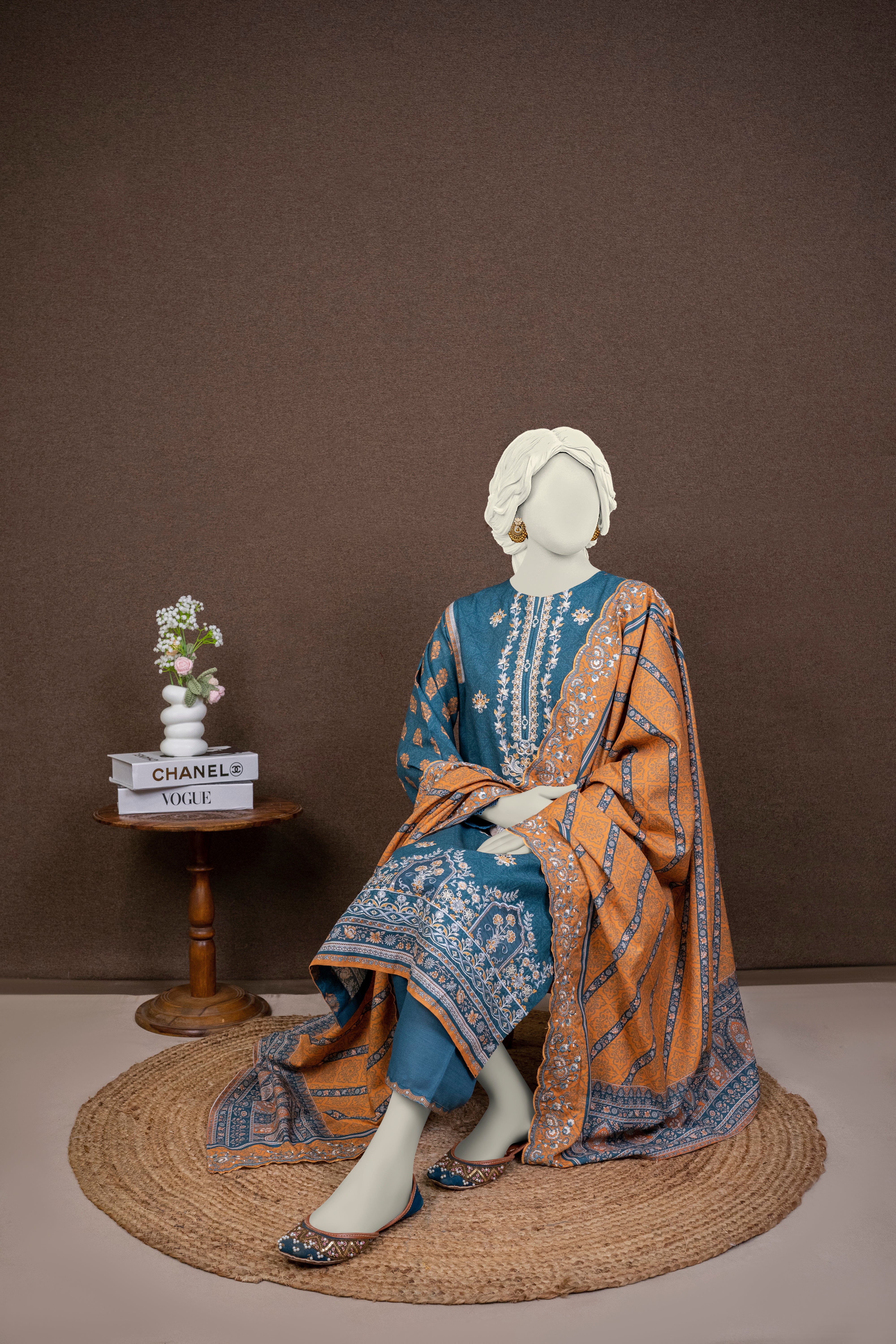 Printed Embroidered Khaddar Suit - Stitched 3 Pc Product code: NPWE3037 Product Details: SHIRT Color: Teal Fabric: Embroidered Khaddar DUPATTA Color: Orange Fabric: Embroidered Khaddar TROUSER  Color: Teal Fabric: Khaddar Note: Actual product color may vary slightly from the image.