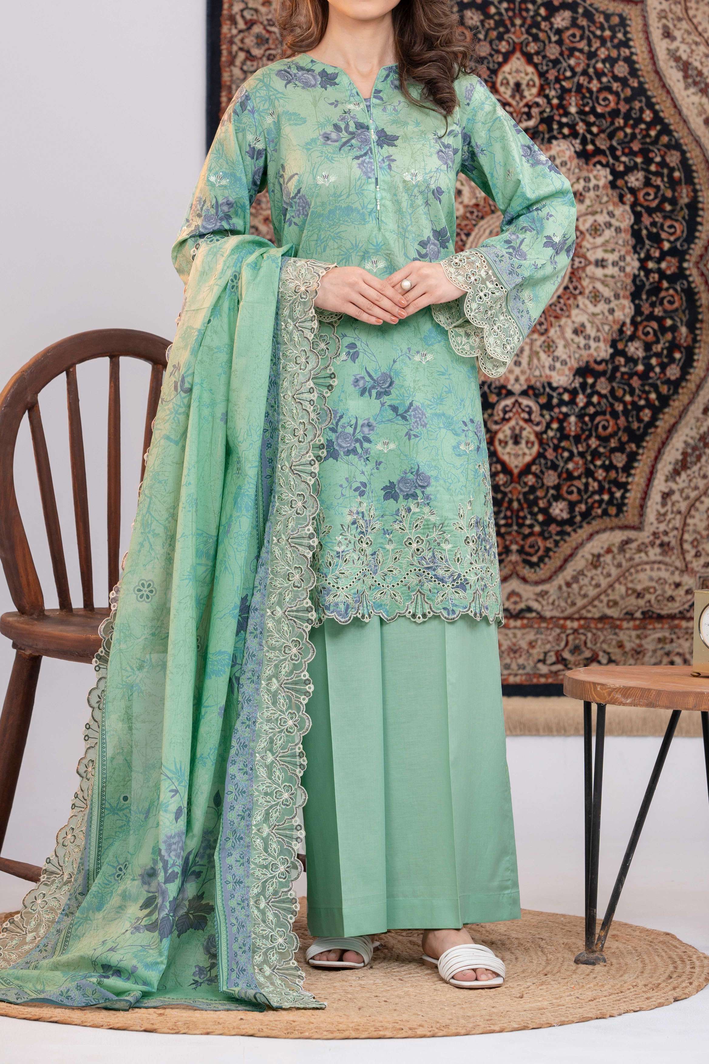 Green Printed Embroidered Unstitched Suit - 3Pc | Product code: NUSLE3054