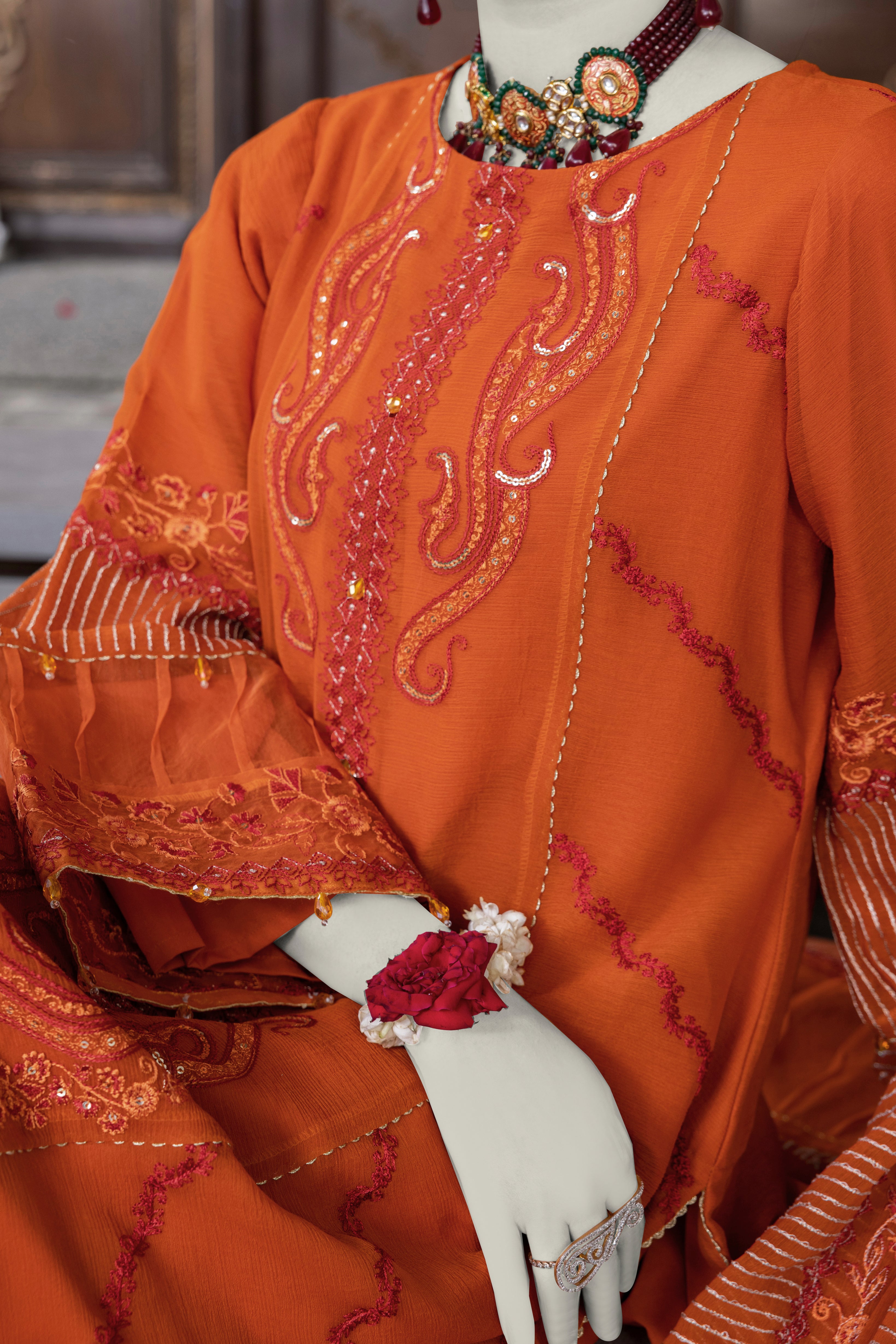 Style your Festive look in this Three-piece Chiffon luxury Shirt, Raw Silk Trousers & Chiffon dupatta embellished with embroidered sequins on borders.