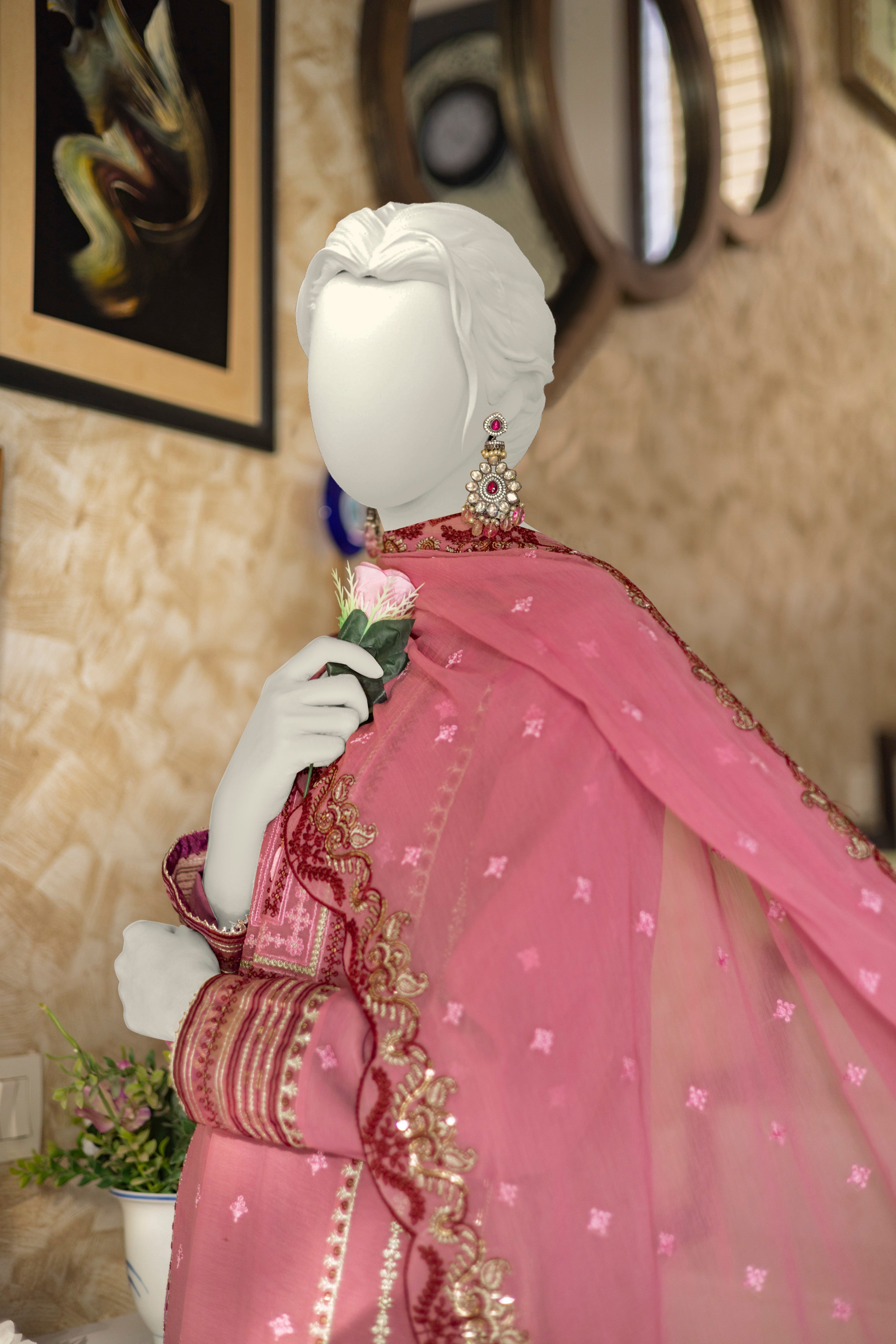 Style your Festive look in this Three-piece Chiffon luxury Shirt, Raw Silk Trousers & Chiffon dupatta embellished with embroidery sequins on borders.